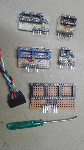 Links sind die Aufnahmen in der ersten einfachen Ausführung zu sehen. Das sind einfache Platinen, bei denen die Pins des Steckers mit denen der IC-Fassung verbunden sind. Rechts sieht man die Komfort-Variante, die für die unterschiedlichen Controllerarten geeignet ist. Hier werden die Verbindungen zwischen Stecker und und Controller über den speziellen Jumper eingestellt.