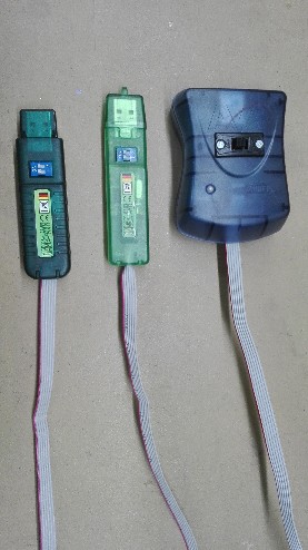 Links zu sehen sind noch die von mir verwendeten Übergangskabel. Der eine ein Standardtyp 6polig mit Stecker/Buchse beidseitig, der andere hat auf der einen Seite die 'normale' 6polige Buschse, auf der Gegenseite ist eine 7polige Buchse passend für eine entsprechende Pfostenleiste, bei der der PIN3 als Verpolschutz entfernt ist.