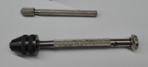 In diese Haltern werden die Bohrer gespannt und beim bohren gehalten. Den kleinere ist ein Kaufteil und eignet sich für die ganz dünnen Bohrer. Der 'große' ist Eigenbau aus Proxxon-Bohrfutter, einem Gewindestück M8x0,75 und das alles mit dem Rest eines alten Feinmechaniker-Schraubendrehers zusammengesetzt.