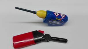 Das ist der mein meist gebrauchter Kleber. Leider trocknet die Spitze schnell ein, daher ist das Feuerzeug zum erhitzen der Spitze unbedingt erforderlich. Wenn andere Materialien als Polystyrol geklebt werden sollen, muss man allerdings auf Sekundenkleber zurückgreifen. Aber Vorsicht, sie neigen zu weißen Ausdünstungen.