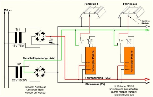 1. Neue Trafos müssen her. Ich habe meine Versorgung wie folgt aufgebaut: Fahrspannung (+18VDC), Umschaltspannung (-24VDC), Licht- und Weichenspannung (16VAC) und die Elektronikversorgung (+5VDC / +24VDC).