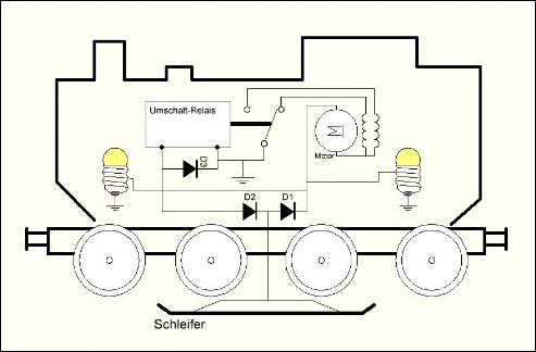 > Im normalen Märklin Betrieb fließt der Strom immer durch Motor, Umschaltrelais und Beleuchtung. Dabei ist der Umschalter so ausgelegt, dass er erst bei Spannungen über 24Volt anspricht und dann auch den Strom durch Motor und Beleuchtung abschaltet. Durch Gleisverschmutzung, Ermüdung der Feder und Verschleiß der Schaltkontakte gerät diese Auslegung aber immer wieder durcheinander und es kommt zum berüchtigten 'Bocksprung' und dem Aufblitzen der Beleuchtung.