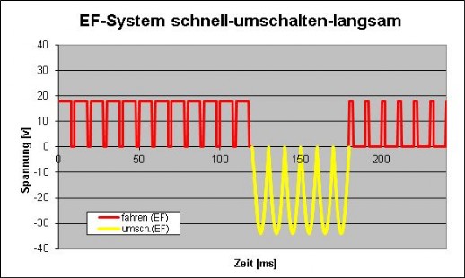 Dadurch, dass bei dem PWM-Betrieb immer die volle Spannung anliegt, werden die Losbrechmomente von Getriebe und Motor leichter überwunden, und - das ist gerade beim Reihenschlussmotor wichtig - es steht für den Anker immer das volle Magnetfeld zur Verfügung. Mit dieser Maßnahme lassen sich die Fahreigenschaften der alten Märklin-Fahrzeuge um Klassen verbessern! Allein das lohnt den Aufwand allemal. Dass Bocksprünge und aufblitzende Beleuchtung der Vergangenheit angehören, kommt noch hinzu. Auch ist die PWM-Spannung stabilisiert. Damit sinkt die Geschwindigkeit der Fahrzeuge am Berg kaum noch ab.