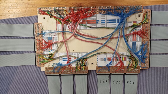 Wie oben schon erwähnt, macht der modulare Aufbau keinen Sinn, wenn er nicht auch in der Elektrik nachvollzogen wird. Wegen der guten Erfahrungen mit den Flachbandkabeln und den Steckern in Schneid-Klemmtechnik, soll das in ähnlicher Form auch bei der neuen Anlage zum Einsatz kommen. Also wird die komplette Verbindung Schaltpult-Anlage wie vorhanden übernommen. Die endet aber jetzt an der Verteilerplatte, von wo aus die Flachbandkabel zu den einzelnen Segmenten führen und dort auf einer Anschlussplatine enden.