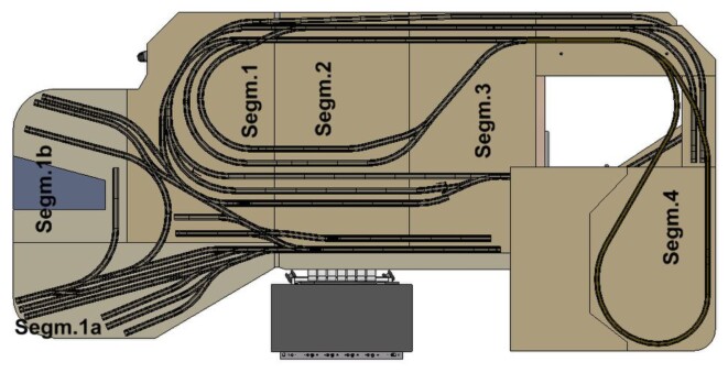 Zunächst habe ich im CAD die einzelnen Segmente mit den Trennstellen geplant. Die Trennstellen sollen natürlich da verlaufen, wo sie am einfachsten ins Gleisbild passen. Die Segmente 1a und 1b sind fertig und sollen so bestehen bleiben, daher sind die Schnittstellen hier fix. Da die Segmenttrennung auch in die Elektrik einfließen soll, wird unter dem Segment 2 eine Verteilerplatte vorgesehen. An der wird einerseits das Schaltpult angeschlossen, andererseits werden hier auch die übrigen Segmente angesteckt.