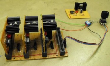 Wie oben schon erwähnt, sind die beiden oben beschriebenen Ausführungen des Fahrreglers sind nur die wichtigsten in einer längeren Reihe von den Entwicklungen. Der erste Versuch passte gerade mal auf eine Euro-Platine (100x160mm) mit einer Transistor Endstufe BC3022 und zwei NE555 für die Taktung. Dann folgten Reduktion auf einen NE555 für die Taktstufe, später der Ersatz der Tranistor-Endstufe durch den L200 wodurch die Spannungsstabilisierung und das Schalten der PWM-Impulse mit einem Bauteil realisiert wurde. Es folgte ein Prototyp mit Taktung per µ-Controller und dann, als aktueller Endstand, wie oben beschrieben die Ausführung mit µ-Controller.