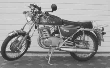 Nach einer einjährigen Pause kam dann die Maico ins Haus. Ein stabiles Fahrwerk, 117 kg Kampfgewicht und das bei sehr kräftiger 27 PS Zweitaktpower. Damit war sie genau das Gegenteil der verflossenen Yamaha. Kompromisslos, für die bergischen Landstraßen ideal, für Touren absolut unbrauchbar. Die unliebsame Begegnung mit einem Autofahrer setzte dem Vergnügen ein jähes Ende.