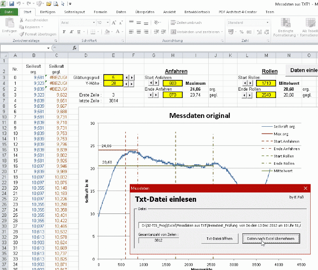 oben: Datenimport von Messreihen, die im TXT-Format vorliegen. Diese werden in Excel beim Import vorbereitet und im Diagramm optisch zur besseren Bewertung dargestellt.