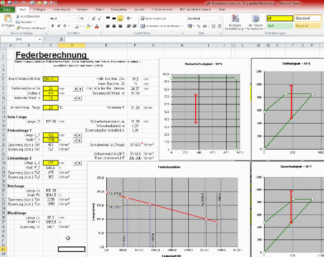 links: Eine Federberechnung mit verschiedenen Diagrammen, die sich jeweils den Ergebnissen anpassen.